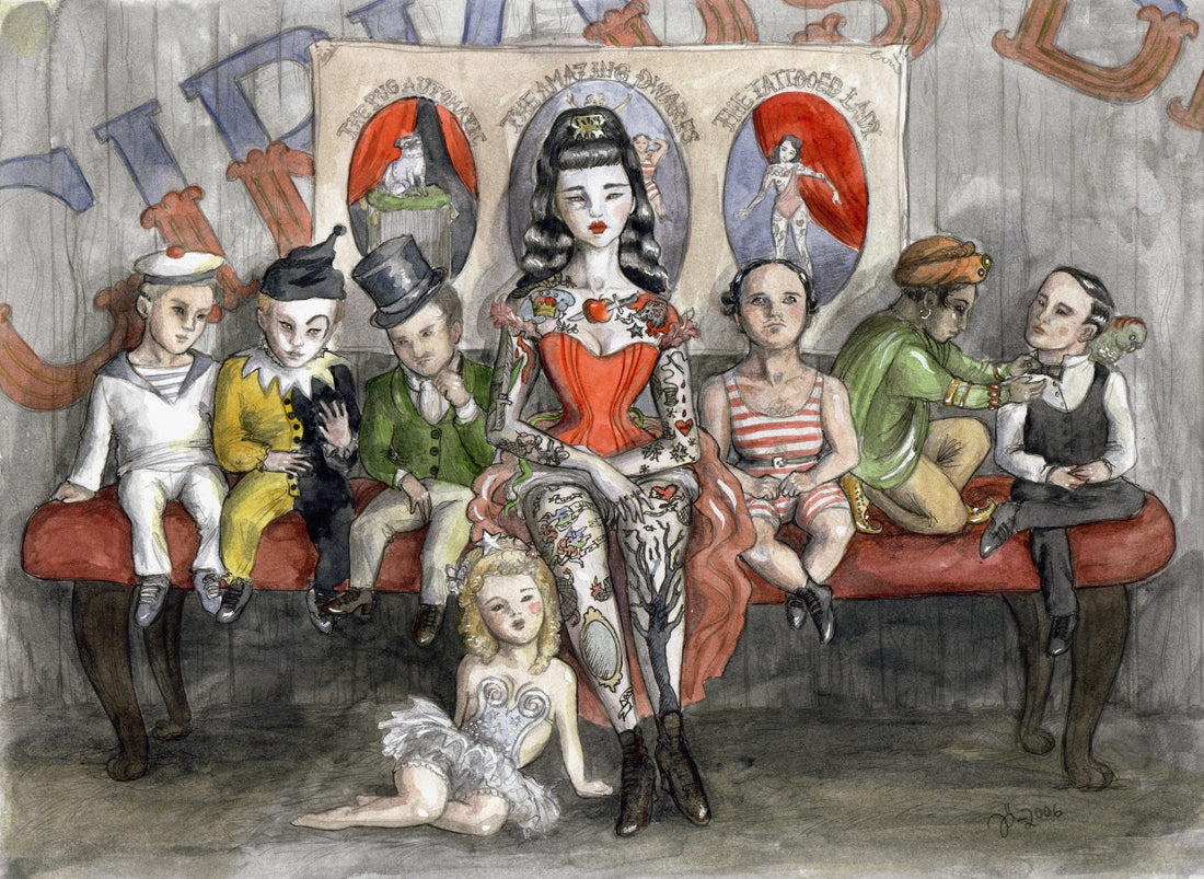 I was commissioned to paint a classic fairytale with a twist. I chose Snow White, who in this version runs away with the circus along with the seven dwarfs instead of leaving with the prince.